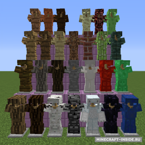 Мод Block Armor добавит в майнкрафт огромное количество новой брони, теперь броню можно крафтить из различных блоков, от земли до снега или бедрока. Различная броня имеет различные эффекты, вся броня поделена на несколько "классов" имеющих одни и те же эффекты, так проще. Броня созданная из анимированных текстур, так же будет иметь анимацию. При добавлении другого ресурспака - изменятся блоки, изменится и броня так же.